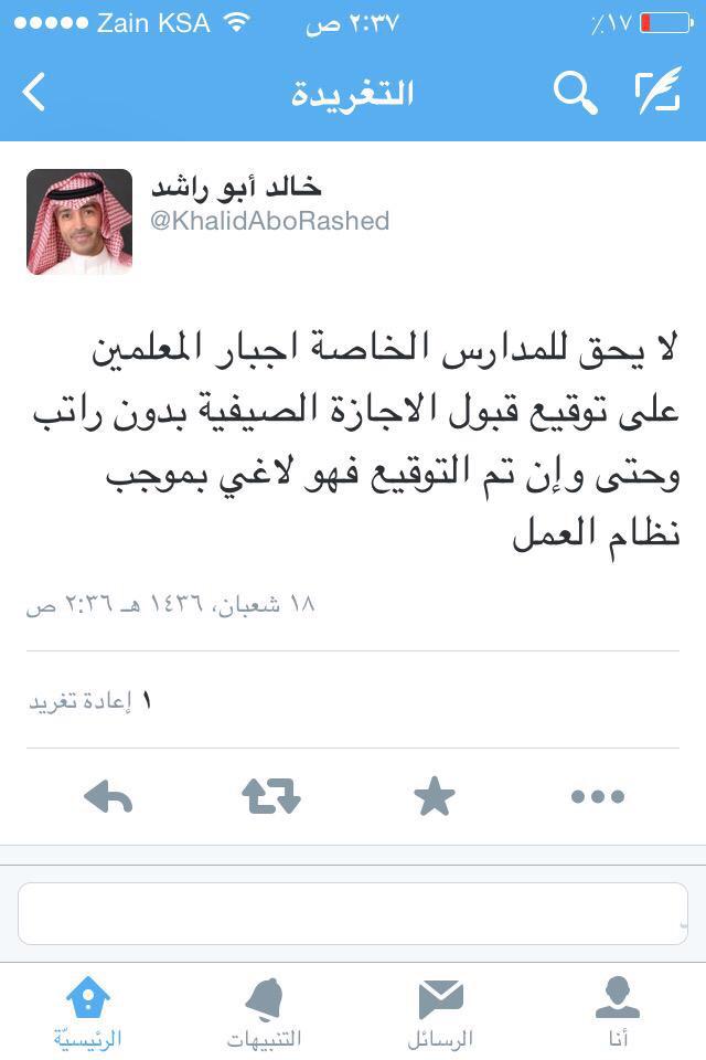 O Xrhsths البوابة التعليمية Sto Twitter لايحق للمدارس الخاصةاجبار المعلمين على توقيع قبول الاجازةالصيفية بدون راتب المحامي خالد أبو راشد Khalidaborashed Http T Co Bd2vgpppxv