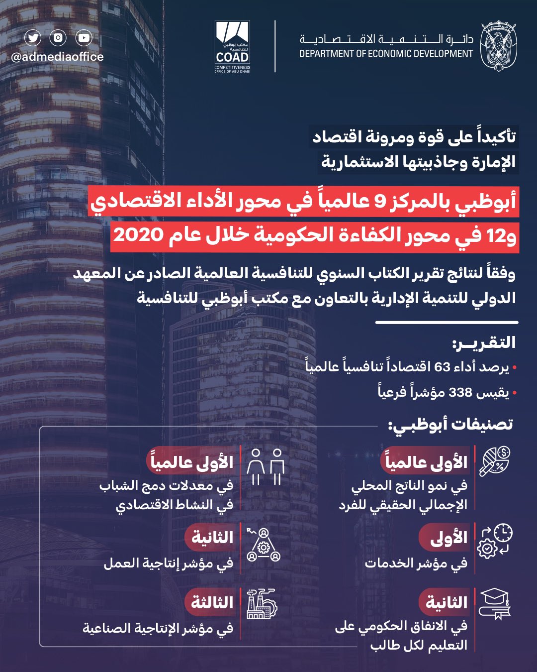 وكالة أنباء الإمارات أبوظبي في المركز التاسع عالميا والثاني إقليميا بمحور الأداء الاقتصادي وام