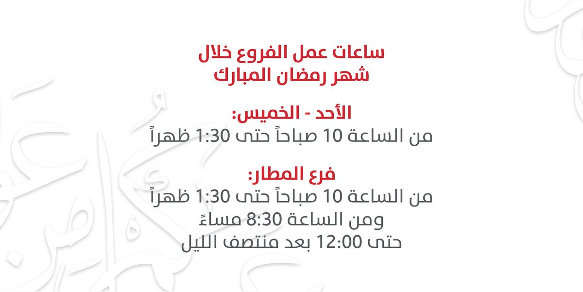 بنك بوبيان No Twitter Dn97x وعليكم السلام أوقات عمل فروعنا لشهر رمضان موضحة في الصورة حياكم الله Http T Co 2amnrntlio