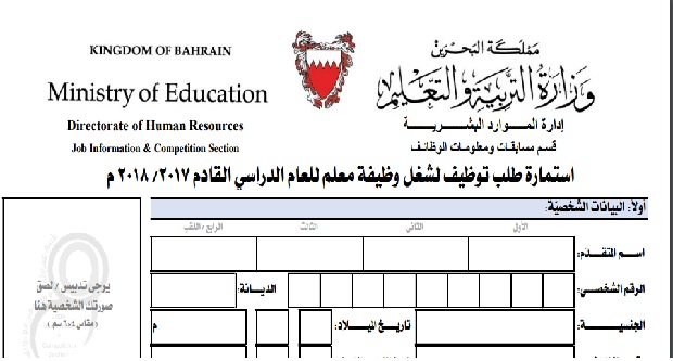 استمارة طلب تقديم وظيفة معلم بوزارة التعليم بالبحرين للعام الدراسي 2017 2018 وظائف الامارات
