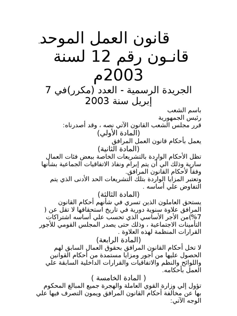 قانون العمل الموحد 010قانـون رقم 12 لسنة 2003 م