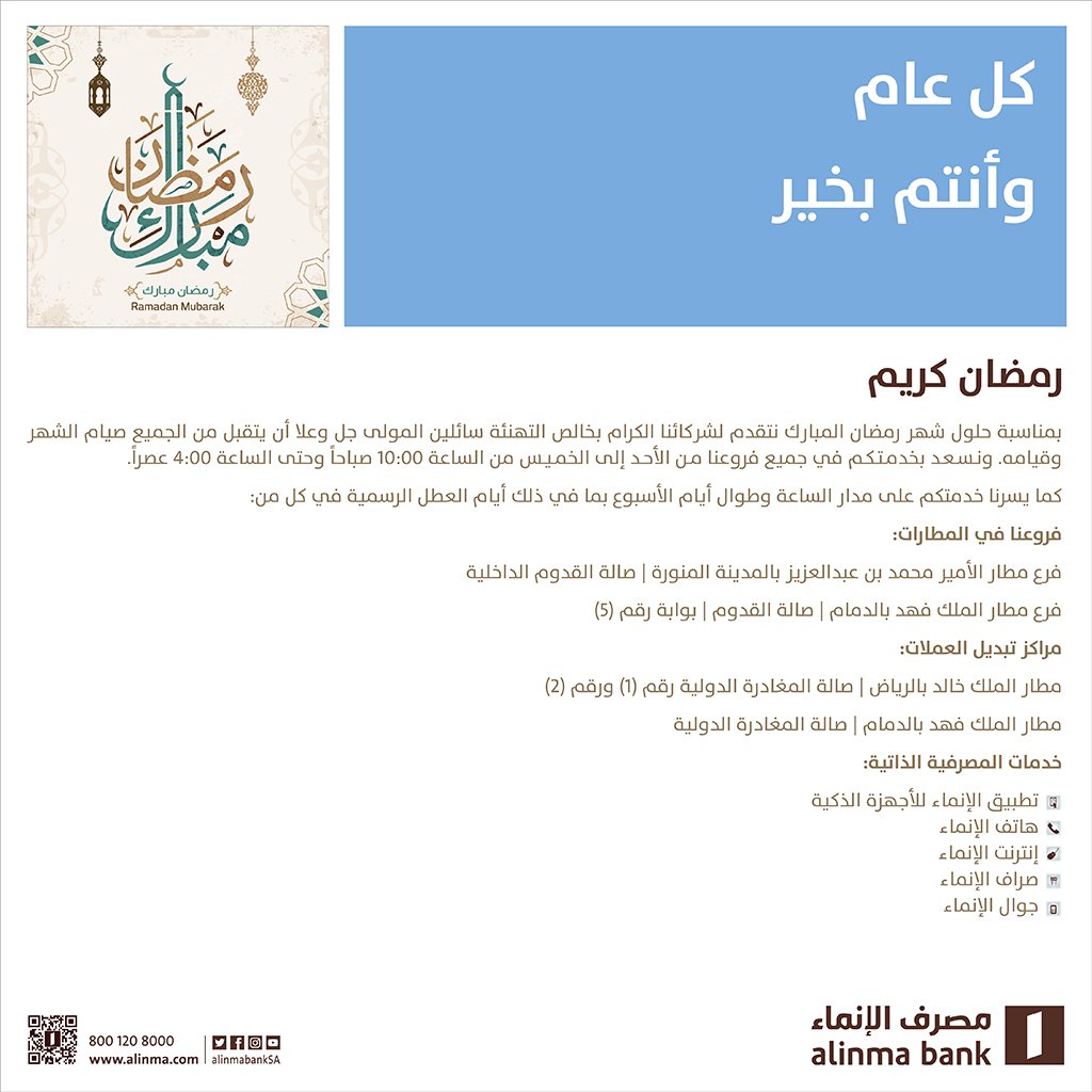 مصرف الإنماء En Twitter فروع الإنماء أوقات عمل فروع مصرف الانماء في شهر رمضان تقبل الله منا ومنكم صالح الأعمال