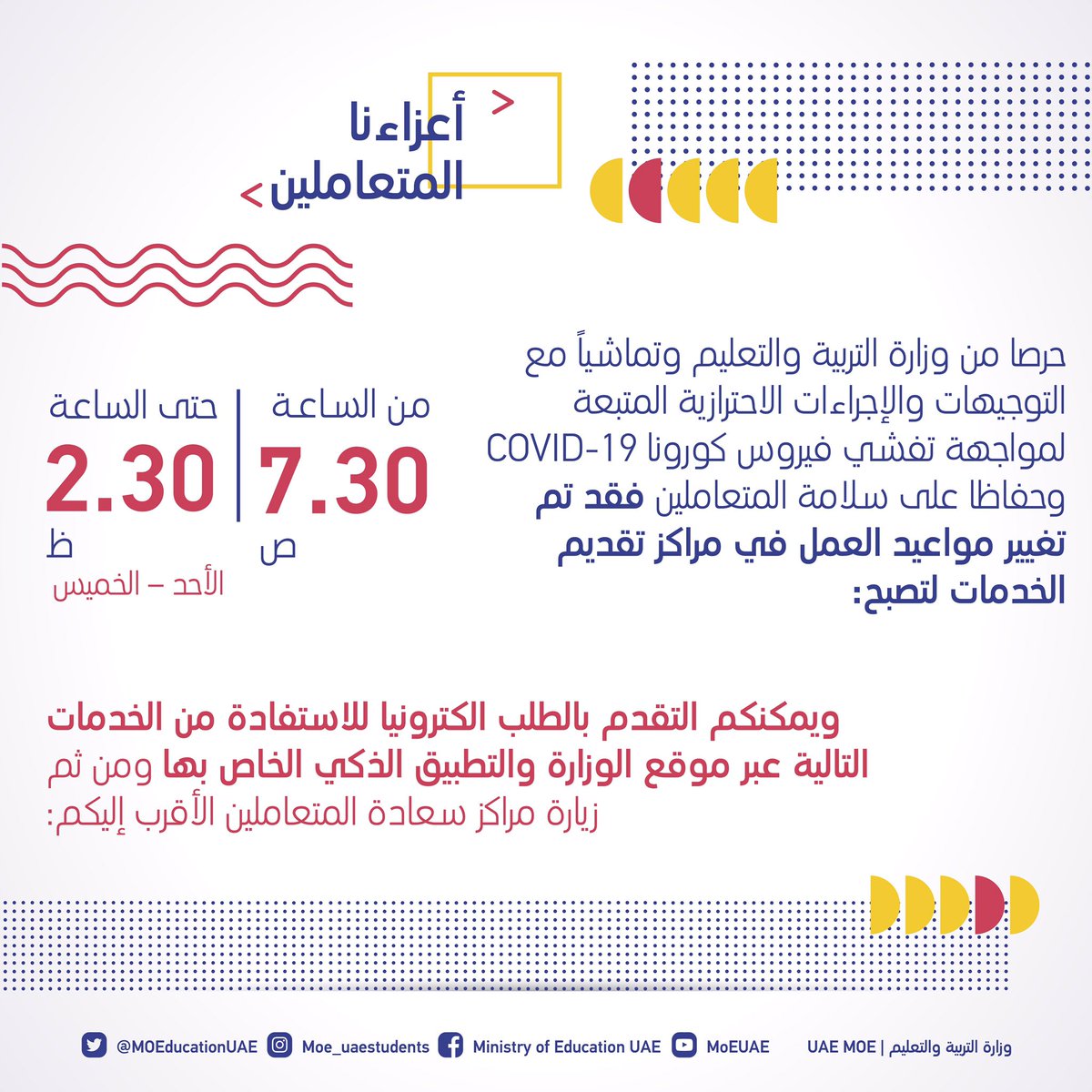 ট ইট র وزارة التربية في إطار حرص وزارة التربية والتعليم على تحقيق بيئة صحية وآمنة لمتعامليها وتماشيا مع جهود الدولة للحد من انتشار فيروس كورونا المستجد تم تغيير مواعيد العمل في مراكز سعادة