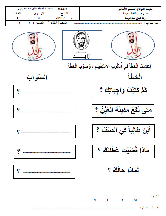 ورقة عمل على أسلوب الاستفهام في اللغة العربية للصف الرابع الابتدائي الفصل الأول نبراس الامارات التعليمى