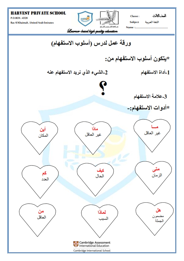 مراجعة أسلوب و أدوات الاستفهام للصف الثالث أوراق عمل