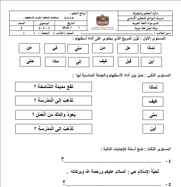 ورقة عمل ادوات الاستفهام الصف الثاني لغة عربية الفصل الثالث 2017 2018 المناهج الإماراتية